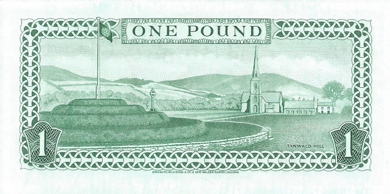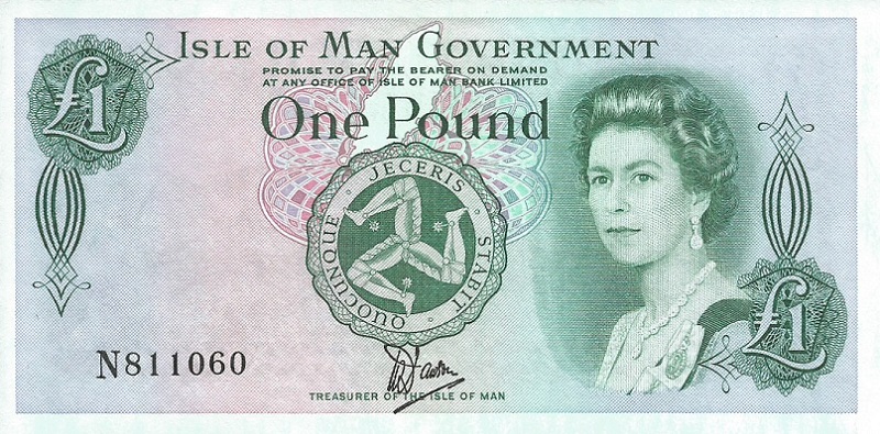 ND (1983). Green on multicolored underprint. Triskele arms at lower center and as watermark, young portrait of Queen Elizabeth II at right. Printer: BWC. Tynwald Hill on back. Printed on Bradvek.