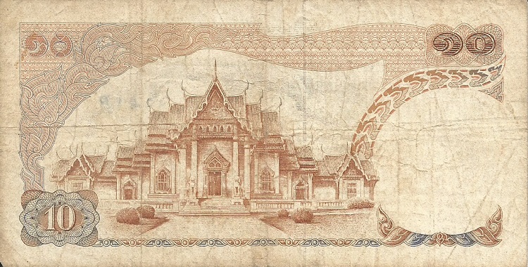ND (1969-1978). Brown and multicolor. Like number 81 but without commemorative line at bottom. Back: Wat Benchamabophitr temple. Watermark: Portrait of King Rama IX. Printer: Thai Banknote Printing Works. Replacement notes: Serial number prefix S-(W).