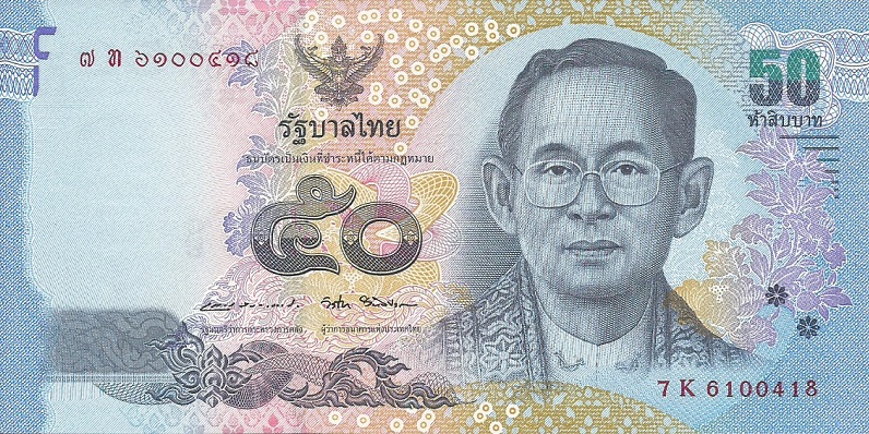 ND (1985-96). Dark blue and purple on multicolor underprint. King Rama IX facing at right, wearing traditional robe. Back: Palace at left, statue of King Rama VII at center, his arms and signature at upper left. Watermark: Portrait of King Rama IX facing, wearing traditional robe. King with pointed eartips. Replacement notes: Serial number prefix S-(W).
