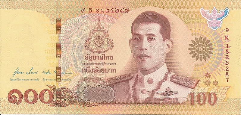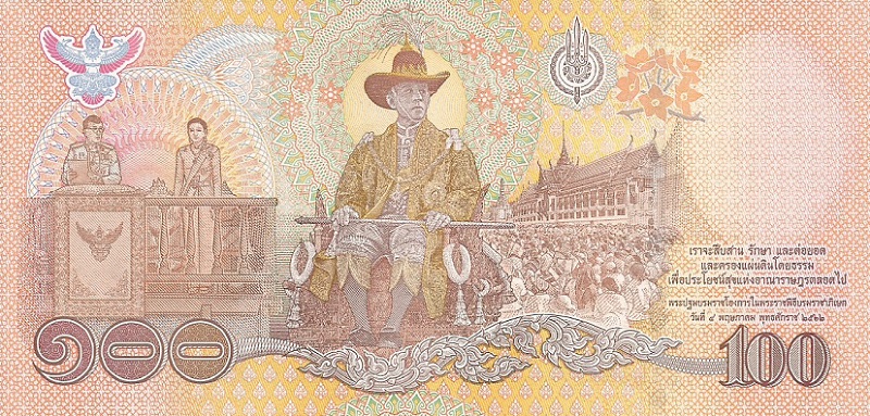 BE2540 1997. Black on light blue and multicolor underprint. King Rama IX in Field Marshal's uniform at center right, arms at upper left. Back: King Rama VI seated at table at center right, royal arms at upper left center, medieval ship's prow. Printer: NPA (without imprint). Polymer plastic.