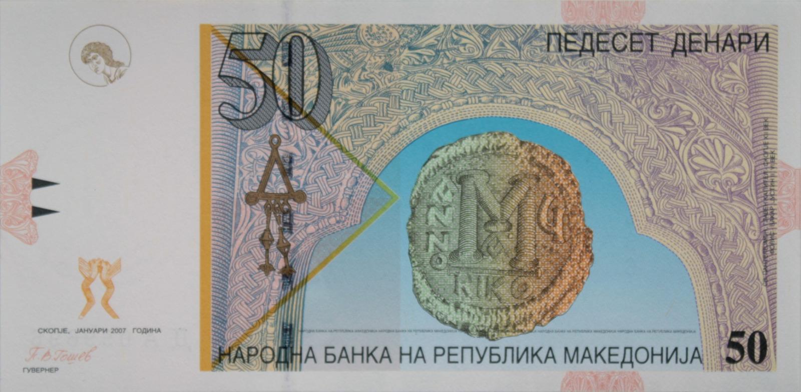 1.2007. Brown with black text on multicolored underprint. Byzantine copper follis of Anastasia at center right and as watermark. Archangel Gabriel at left center on back. One signature at bottom left.