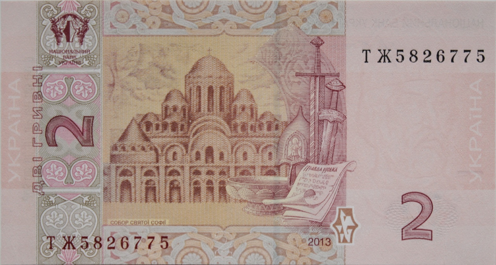 2013. Brown on multicolor underprint. Yaroslav the Wise at right. Back: Cathedral of St. Sophia in Kylv. Watermark: Yaroslav the Wise.