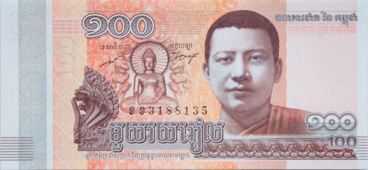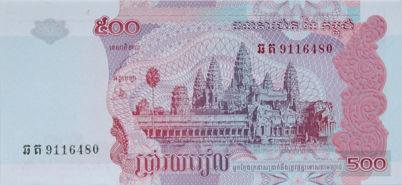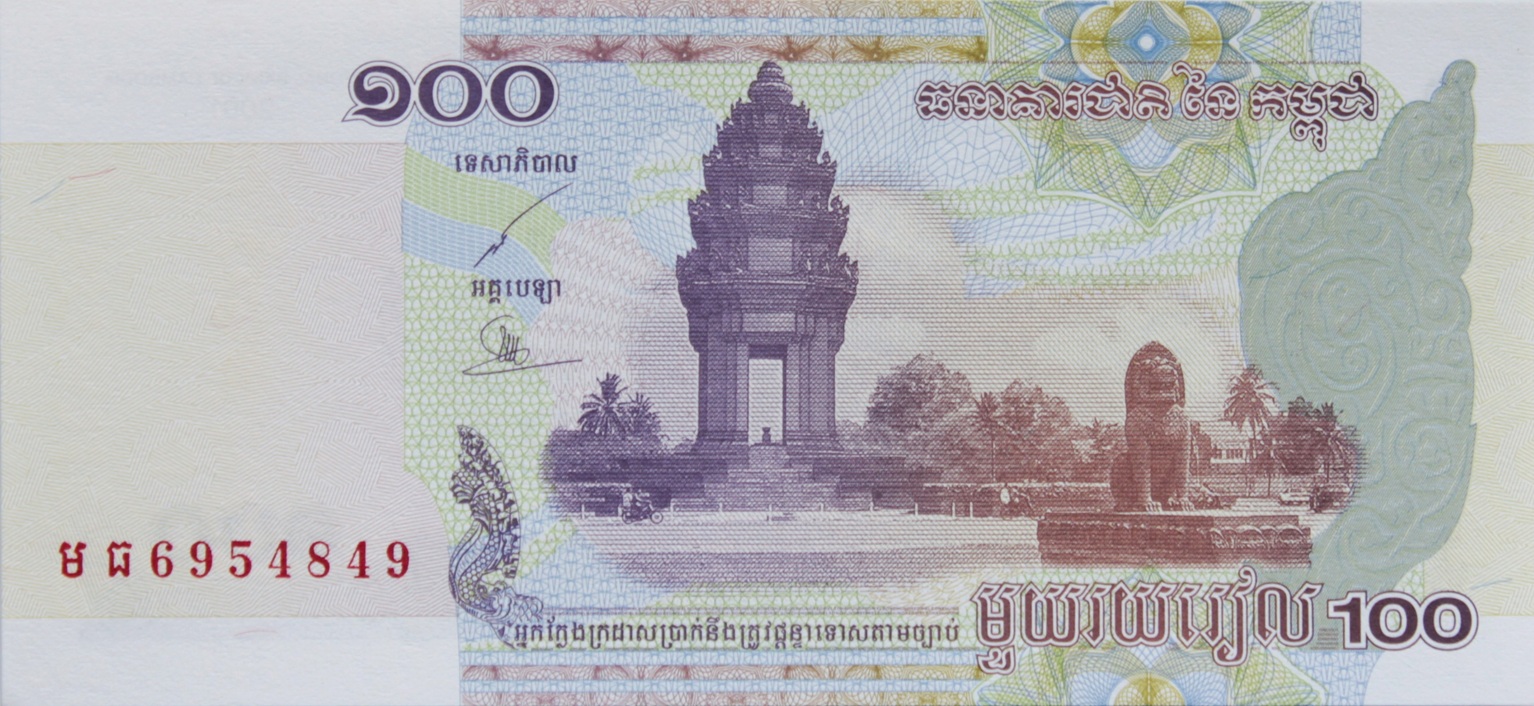 2004. Red and purple on multicolored underprint. Angkor Wat temple at center. Bridge spanning Mekong river at Kampong Cham at center on back. Naga heads sculpture at lower left center. Watermark: multiple lines of text.