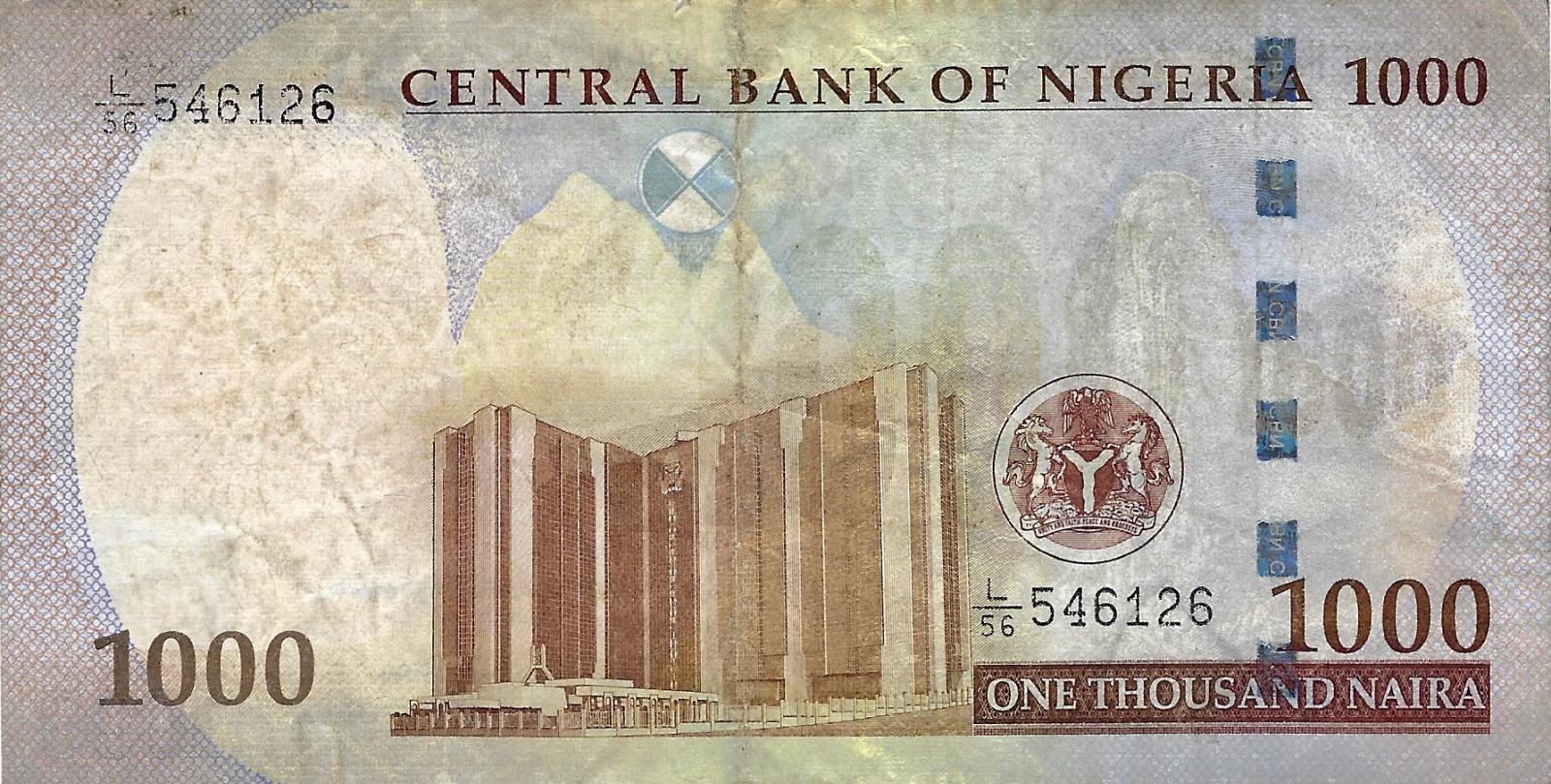 2015. Brown, lilac and multicolor underprint. Alhaji Aliyu Mai-Bornu and Dr. Clement Isong at left center. Back: Central Bank building.