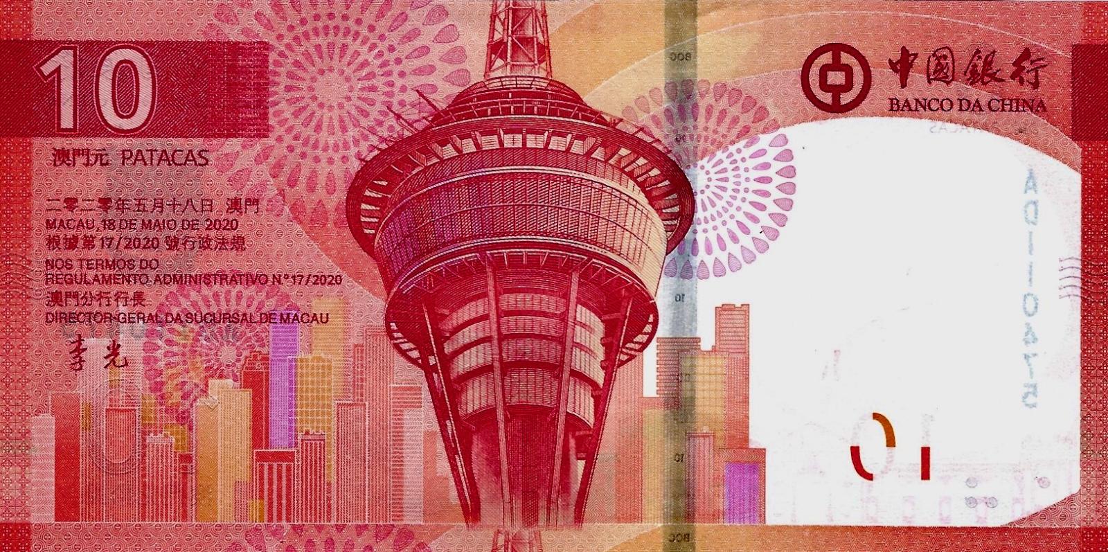 MACAU, 18 DE MAIO DE 2020 (issued in January of 2025). Red on red, pink, and yellow underprint. Stylized dragon at center right, tall building behind; Banco da China at top right. Back: top of tower at center left, city in background at bottom.
