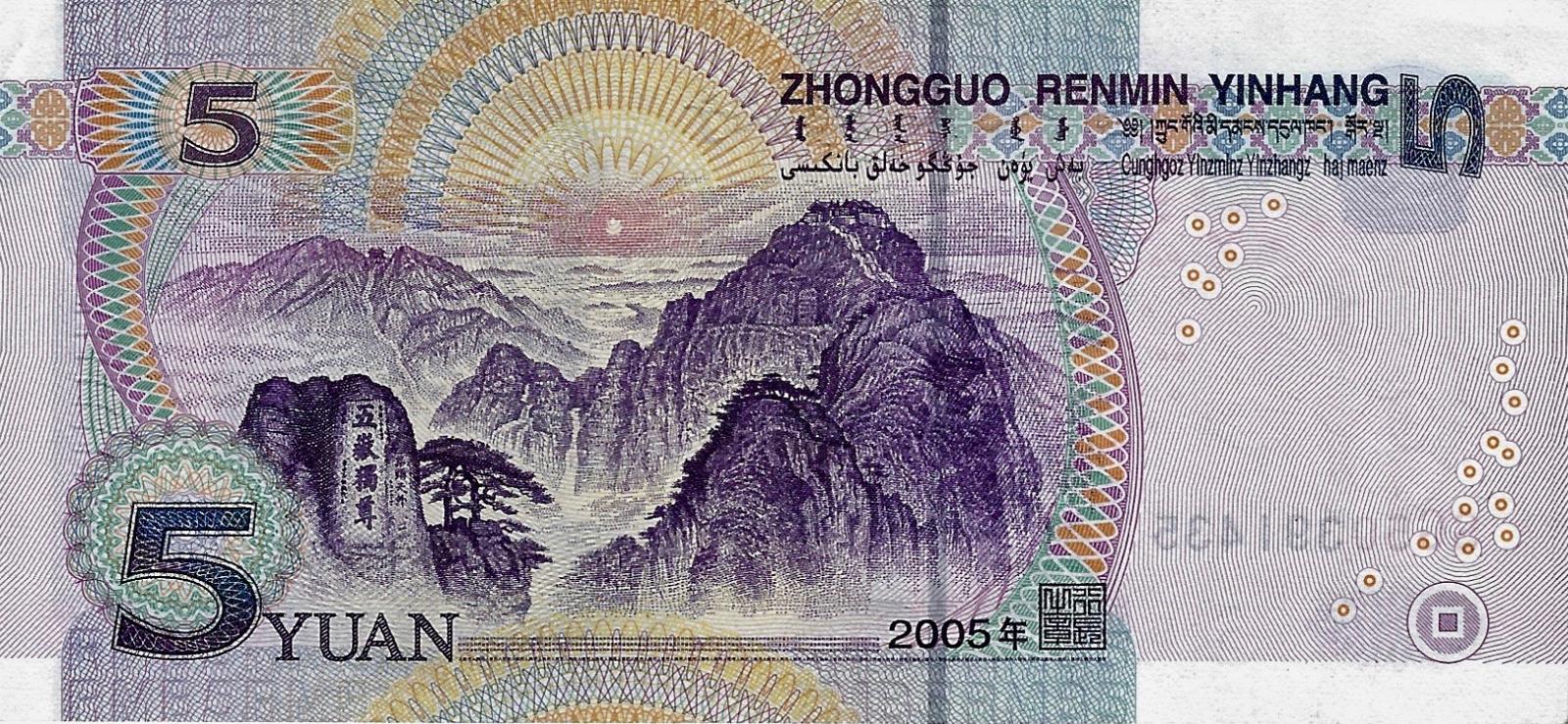 2005. Violet on multicolored underprint. Mao Zedong at right. Back: mountain valley view. Serial number prefix format: letter, letter, number, number.