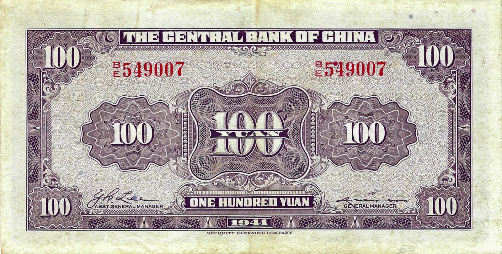 China pick 243a: 100 Yuan from 1941