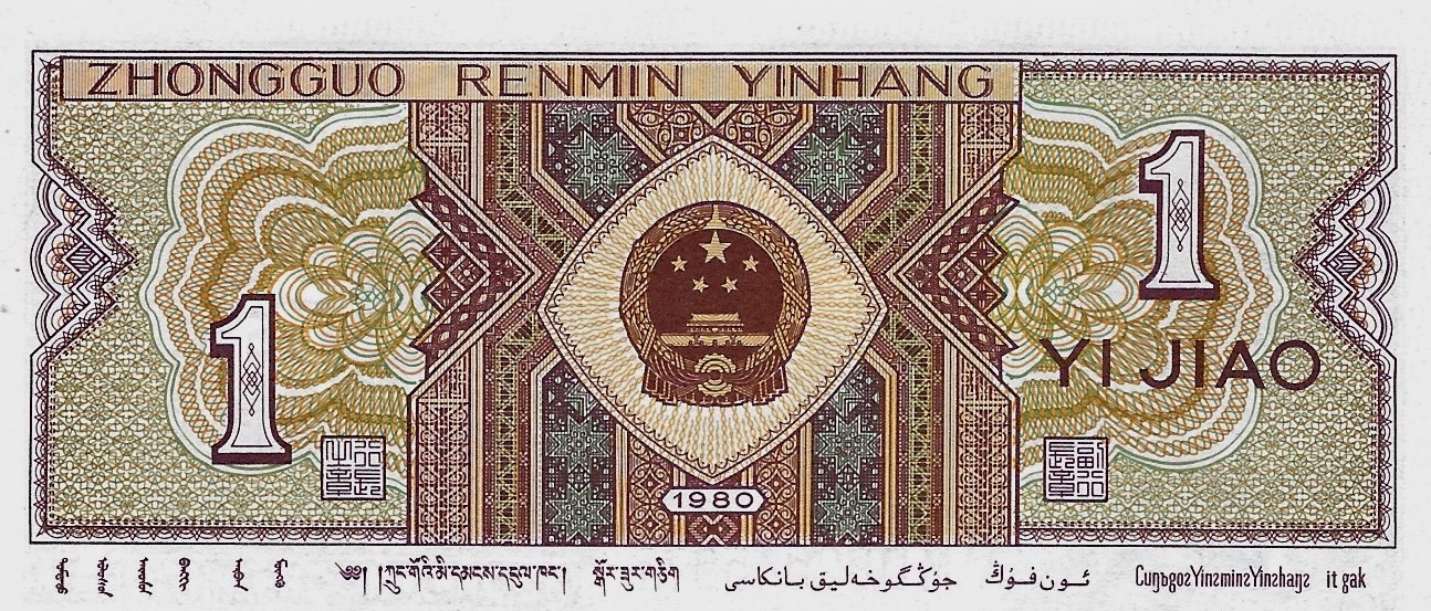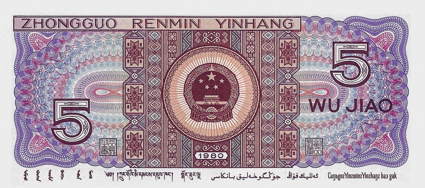 1980. Brown-violet on multicolored underprint. Dong and Yao youths at right. Great Wall at center on back. Arms at upper left, stylized birds in underprint at center, dot patterns for poor of sight at lower left or right on face. Engraved. Dark blue serial number. Watermark: ancient Pu (pants) coin repeated.