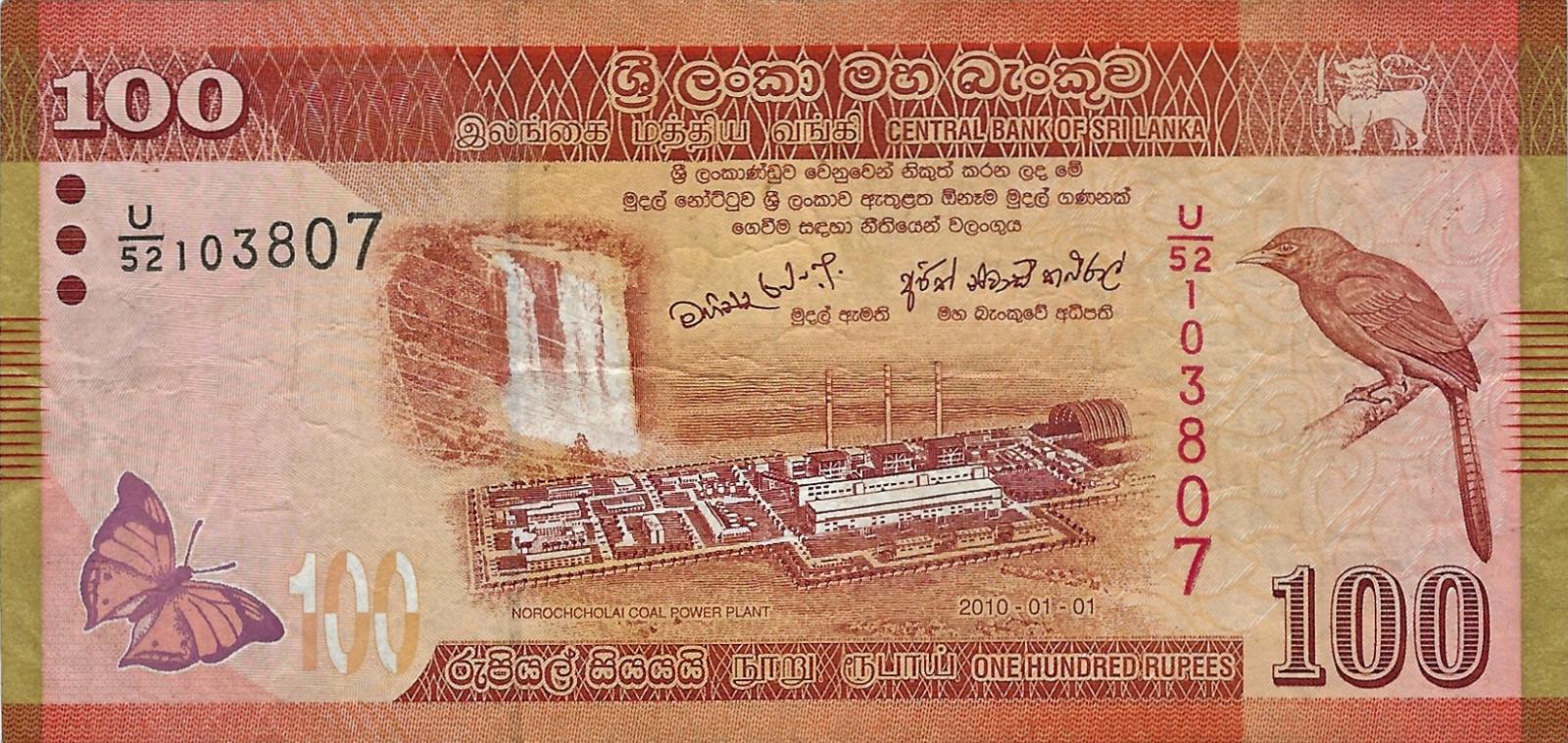 1.1.2010. Orange and yellow. Norochocholai Power plant at center, orange billed babbler at right. Back: Bharatanatyam dancer and Mridirangam drummer. Vertical format. Watermark: Babbler and 100. Printer: DLR. Issued banknote.