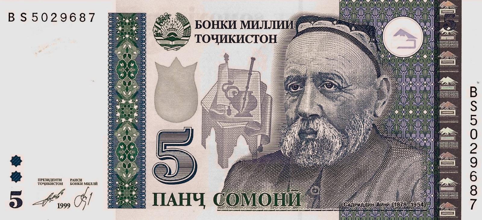 1999 (2000). Purple on tan underprint. Statue of Ismoili Somoni at center. Back: Road in a valley. Watermark: Two mountains over rectangle. Printer: German. Nominal value and bank name reflect UV.