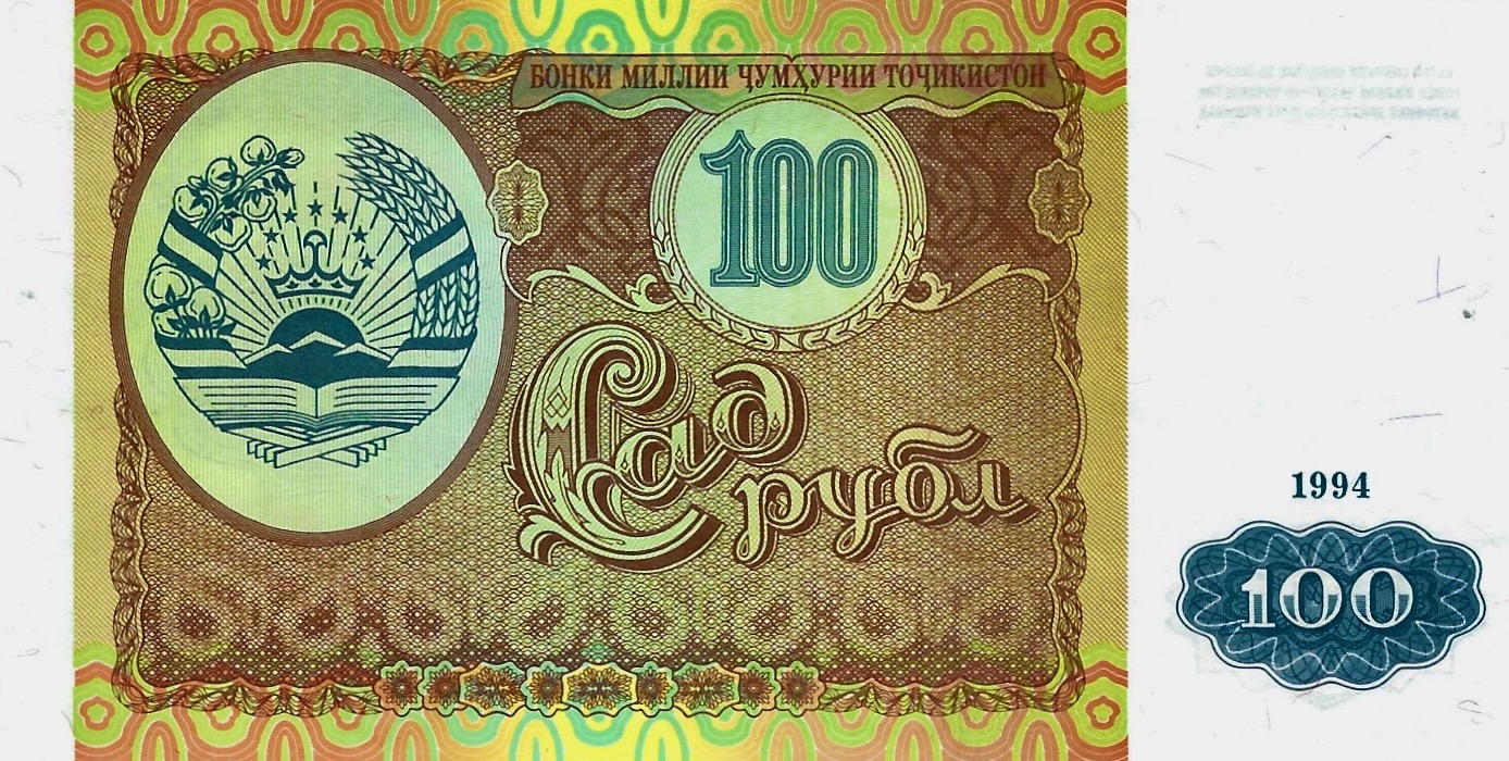 1994. Brown on multicolor underprint. Arms at upper left. Back: Majlisi Olii (Parliament). Watermark: Multiple stars. Printer: Goznak, Moscow (without imprint).