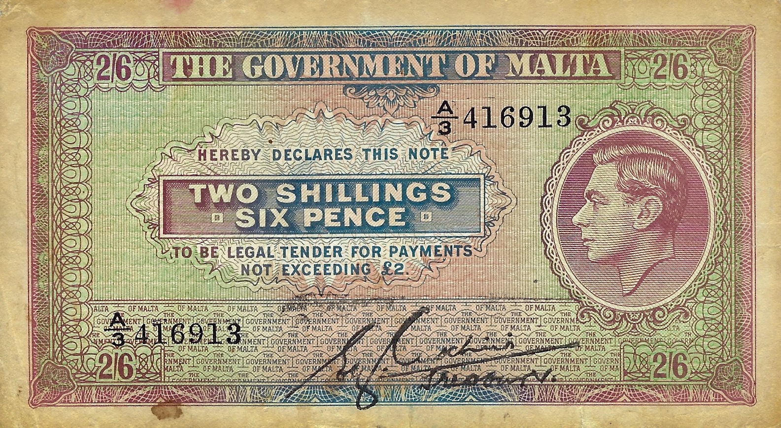 Law of 1949 (1951). Green. English George Cross at left, portrait of King George VI at right. Printer: TDLR.