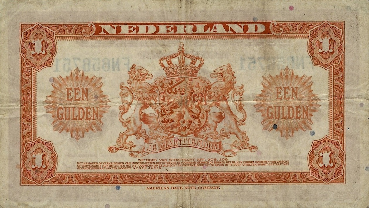 4.2.1943. Red. Portrait Queen Wilhelmina at center. Back: Orange. Arms at center. Printer: ABNC.