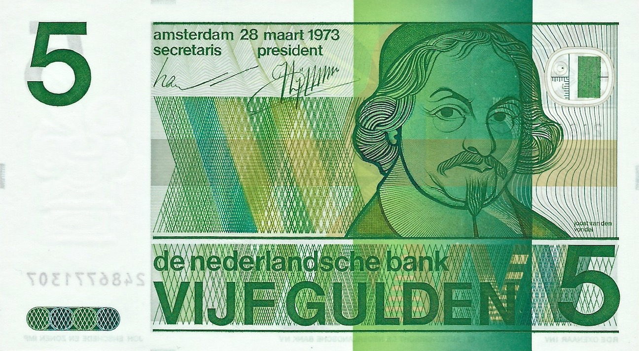 28.3.1973. Dark green on green and multicolor underprint. Joost van den Vondel at right. Watermark: Inkwell, quill pen and scroll.
