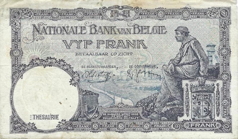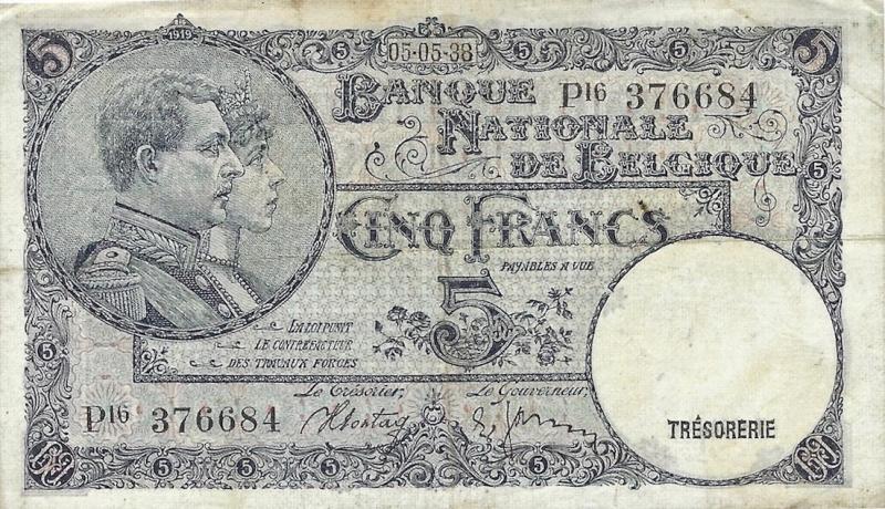 1.3.1938-11.5.1938. Blue on light brown underprint. Portrait King Albert and Queen Elisabeth at left. Like number 93 but with overprint. 2signature varieties. Back: Seated man looking at factory scene. Overprint: TRÉSORERIE - THESAURIE on face.
