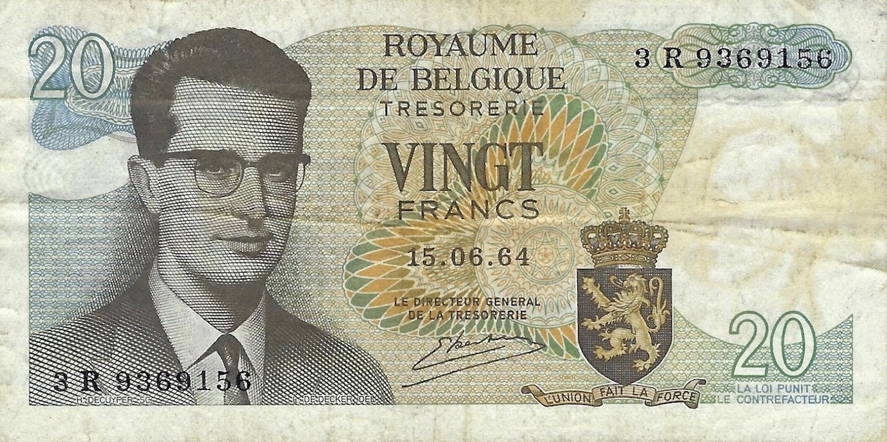 15.6.1964. Black on blue, orange, and multicolored underprint. King Baudouin I at left and as watermark, arms at lower right. Atomium complex in Brussels at right on back.