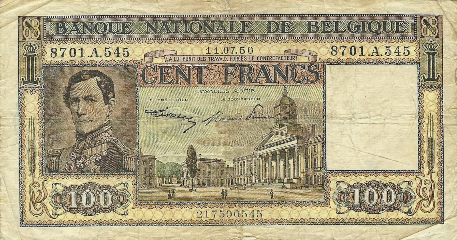 3.11.1945-31.12.1950. Brown, pink and yellow. Portrait Leopold I at left, Justice Palace, Brussels at center. 2 signature varieties. Back: Mounted troops at center right.Watermark: Leopold I.