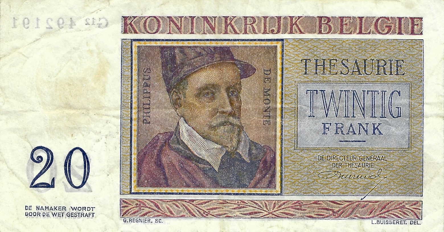 3.4.1956. Lilac, violet and blue. Portrait R. de Lassus at center. Back: Portrait P. de Monte at center.Watermark: King Leopold I.