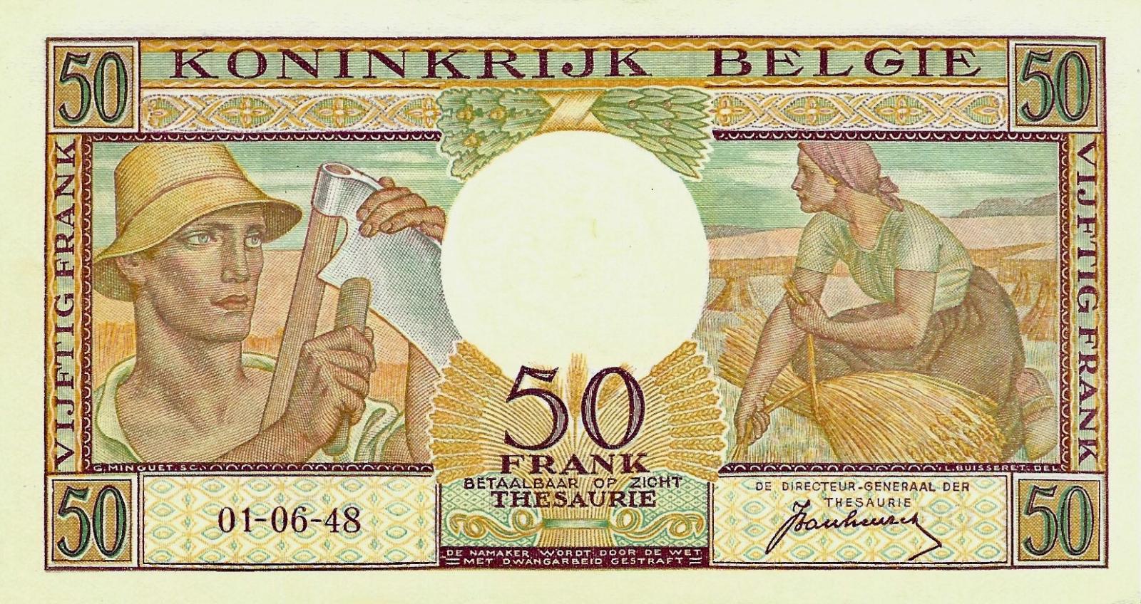 1.6.1948. Yellow, green, violet and multicolor. Farm woman with fruit at left, man planting a tree at right. Back: Farmer with scythe at left, woman with sheaf at right.Watermark: King Leopold I.