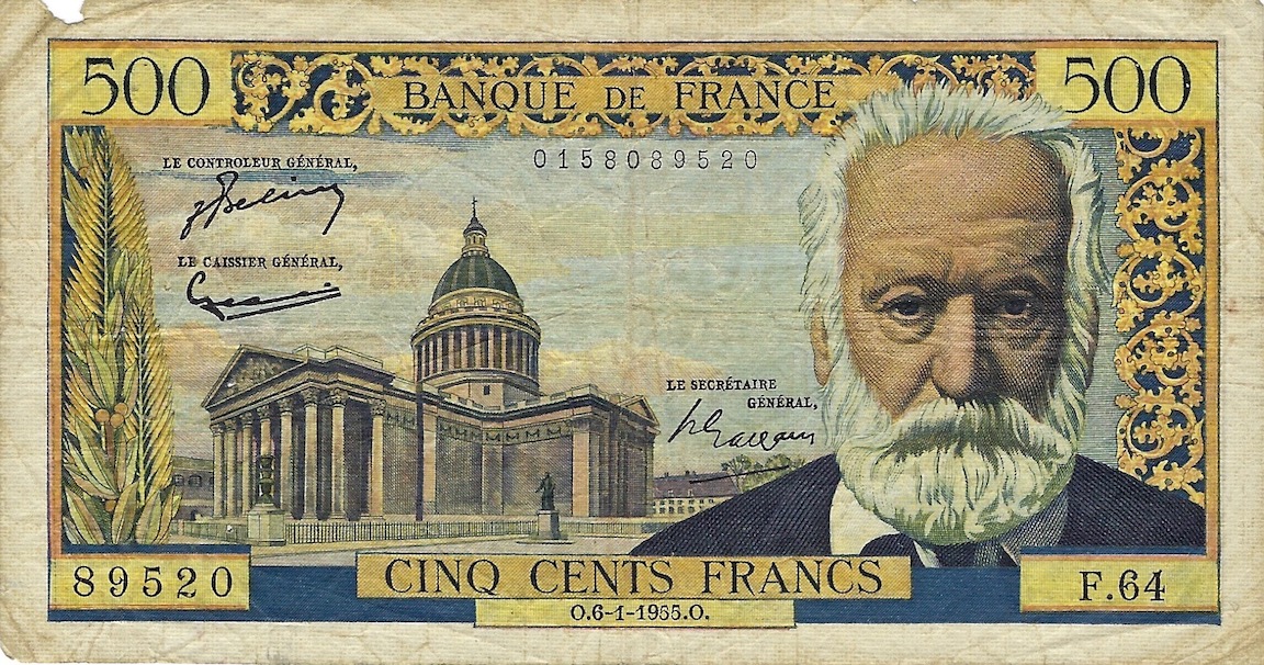 7.1.1954-4.8.1955. Blue, orange and multicolor. Building at left, Victor Hugo at right. Back: Hugo at left, Pantheon in Paris.