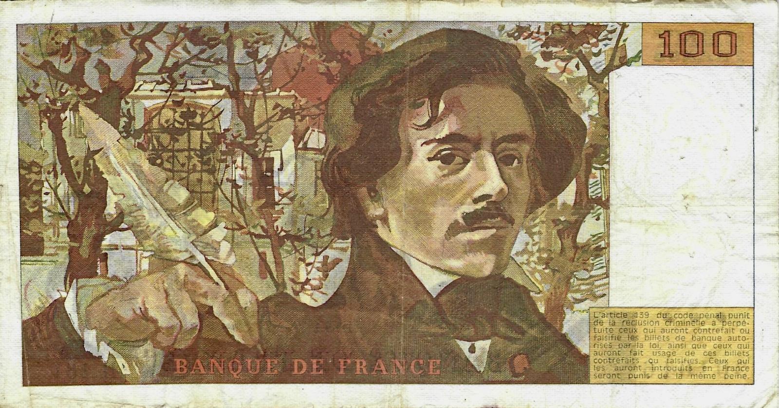 1991. Brown. Eugene Delacroix at left center and as watermark. Marianne holding tricolor, part of Delacroix' painting "La Liberte Guidant le Peuple" at right. 'Cent Francs' at upper left on face not just faint outline but has a fill color as well.