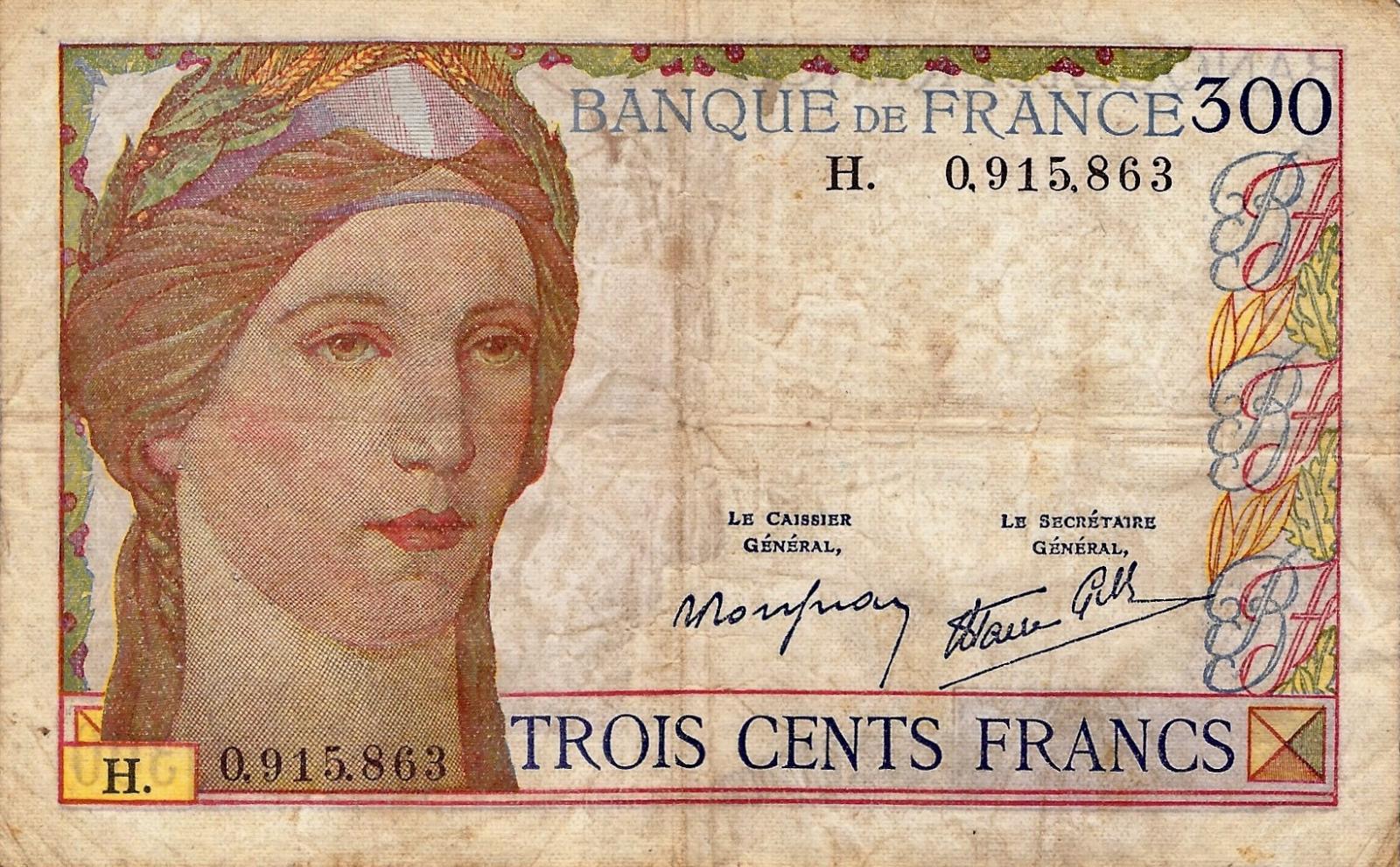 2.2.1939-5.3.1942. Blue. Minerva at upper left. Back: Sitting farm woman. With signature title: LE CAISSIER GÉNÉRAL.