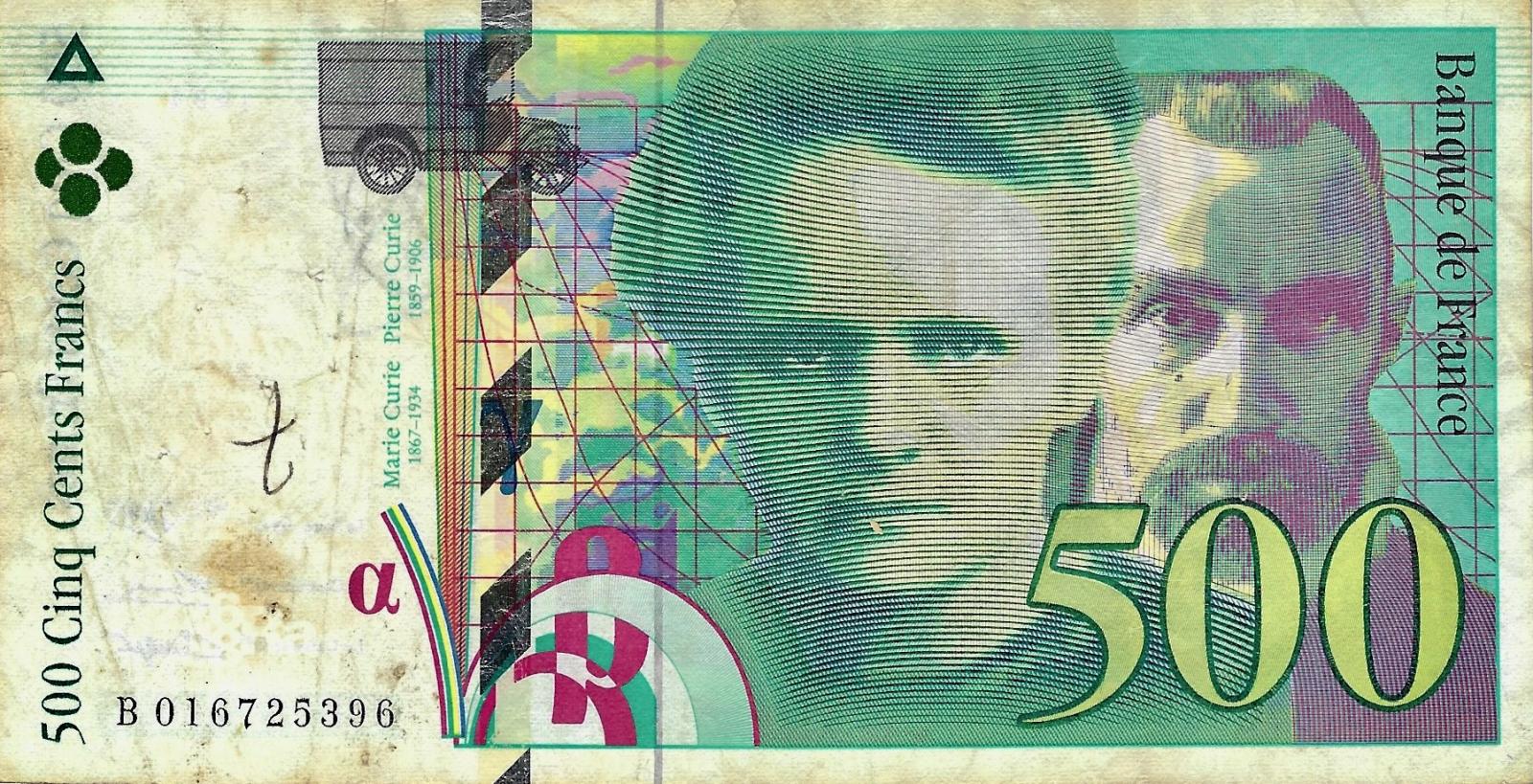 1994-1995. Dark green and black on multicolored underprint. Marie and Pierre Curie at center right. Segmented foil strip at left. Laboratory utensils at left center on back. Watermark: Marie Curie.