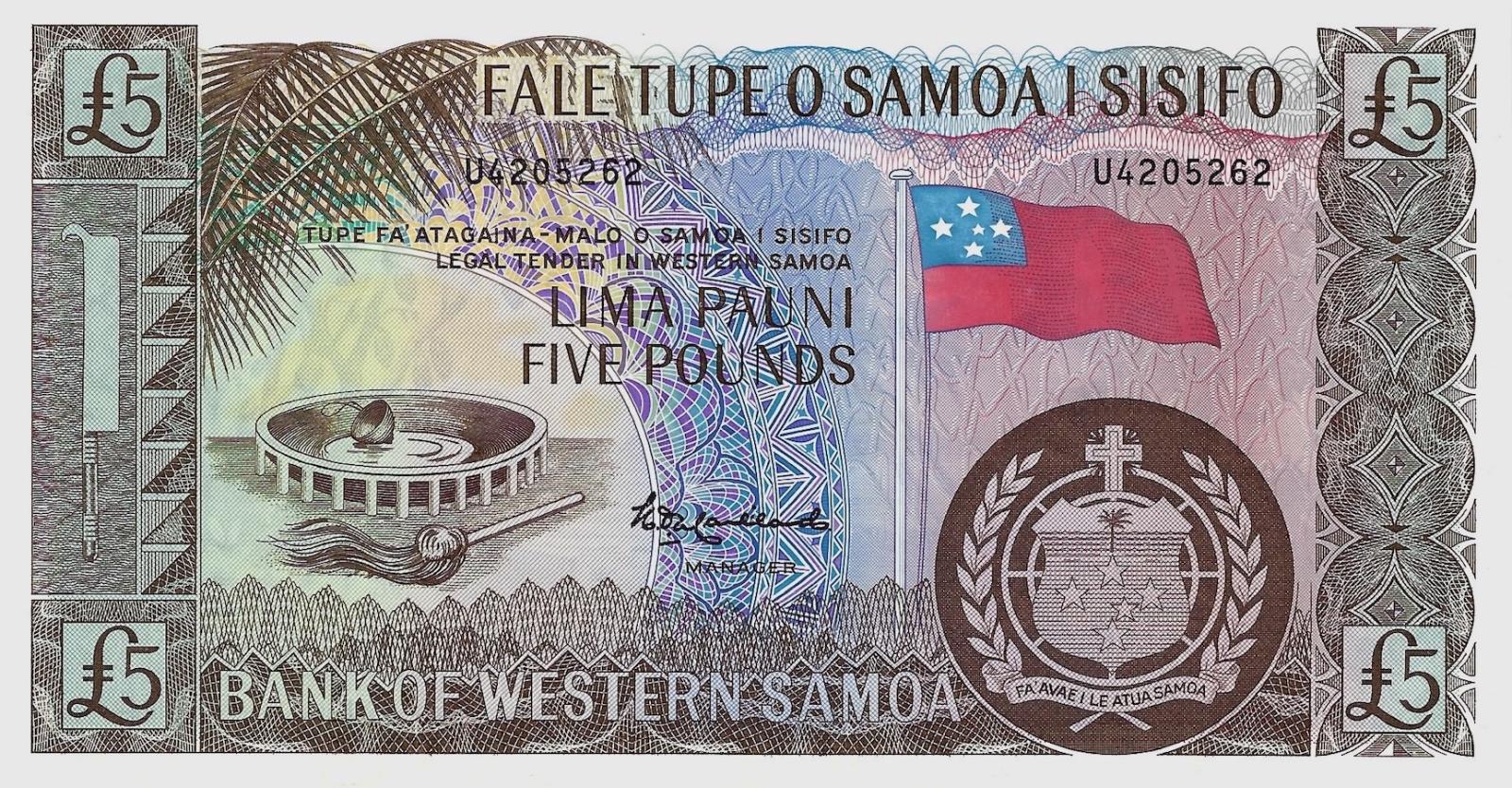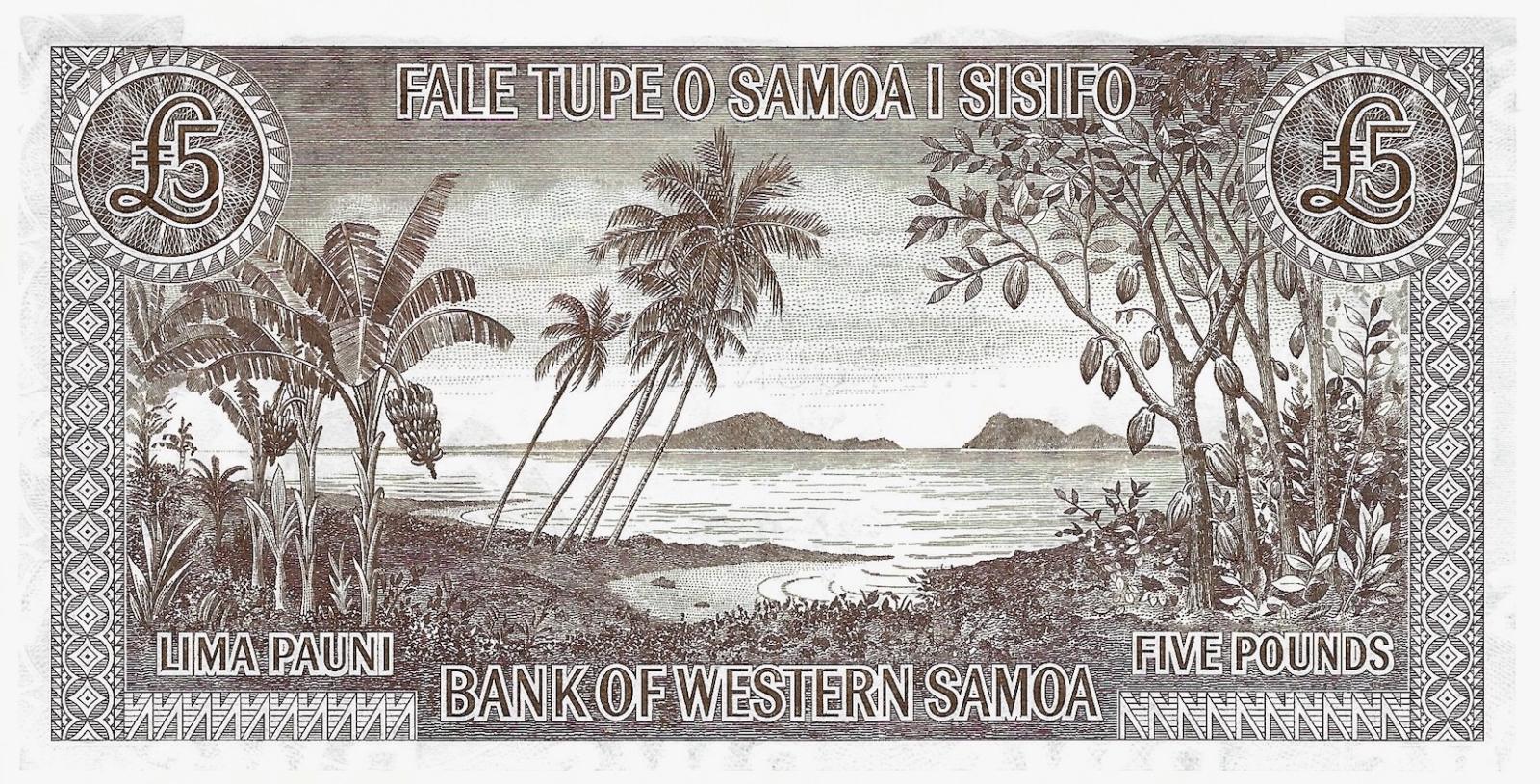 ND (1980). Dark green on multicolor underprint. Two weavers at right, national flag at left center. Back: Two fishermen in canoe at left center, arms at lower center, national flag at center right. Watermark: M. Tanumafili II.