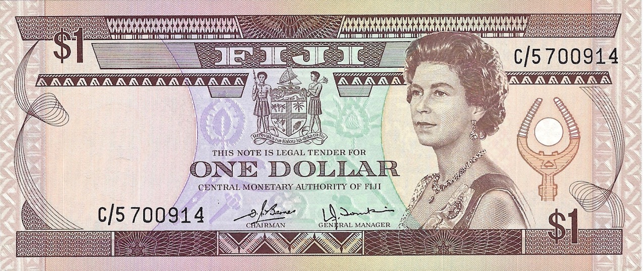 ND (1980). Brown on multicolored underprint. Queen Elizabeth II at right center, arms at center, artifact at right. Open air Suva markets at center on back. Denomination figures 8mm high. Watermark: profile Fijian head. Printer: TDLR.
