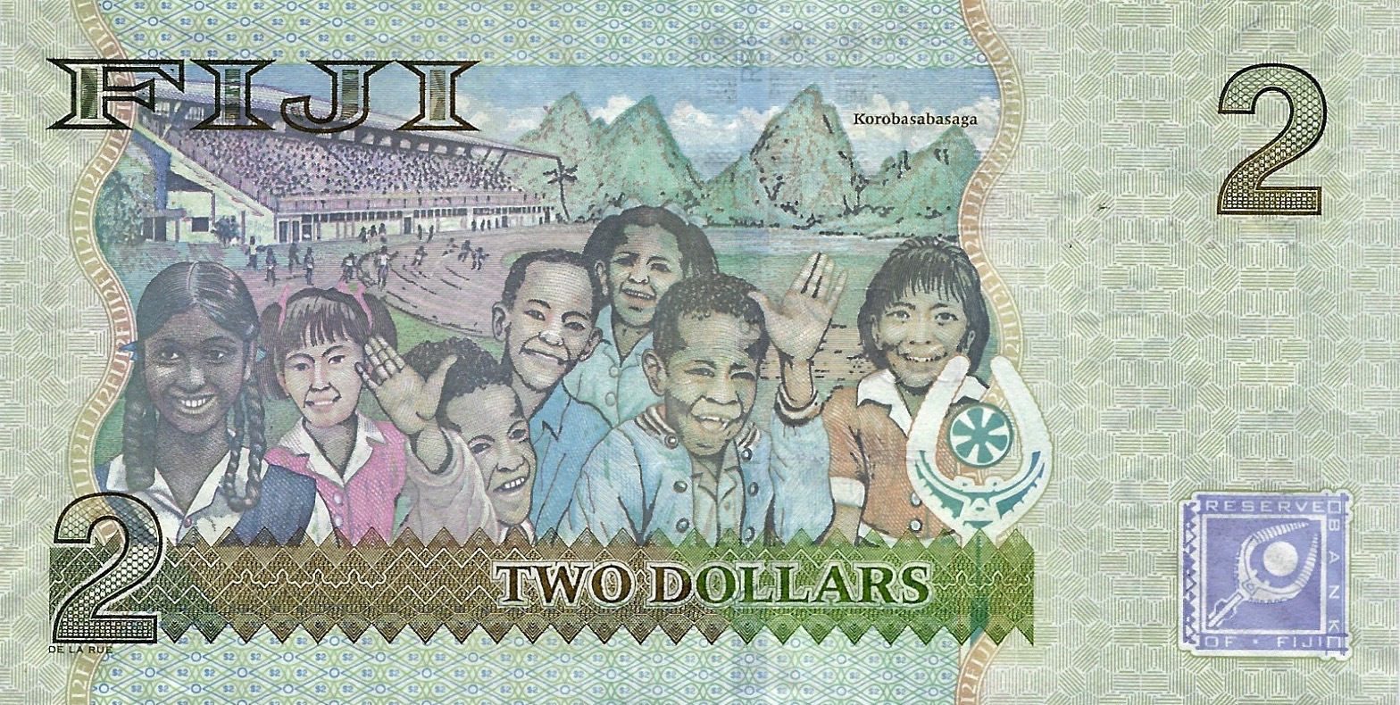 ND (2007). Green on multicolored underprint. Mature bust of Queen Elizabeth II at right, arms at upper right. Novel numbering on both serial numbers. Mohar (sovereign locket) at lower left. Back: faces of diverse group of children during school games. Fiji National Stadium at left. Mount Korobas. Signature title Governor.