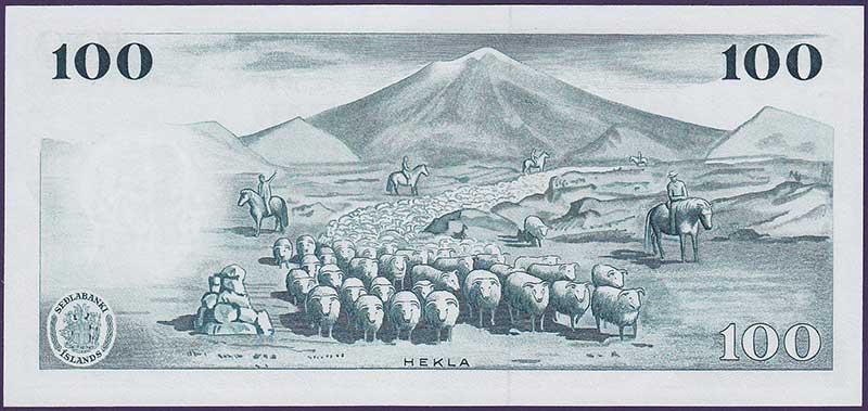 Law of 1961. Dark blue-green on multicolored underprint. Tryggvi Gunnarsson at left. Sheepherders on horseback, sheep in foreground, Mt. Mekla in background on back. Watermark: S. Bjornsson.