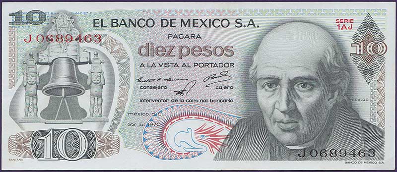 22.7.1970. Dark green on multicolor underprint. Bell at left, M. Hidalgo y Castilla at right, bank titie with S. A. 3 signatures and signature varieties. Back: National arms and Dolores Cathedral. Printer: BdM.