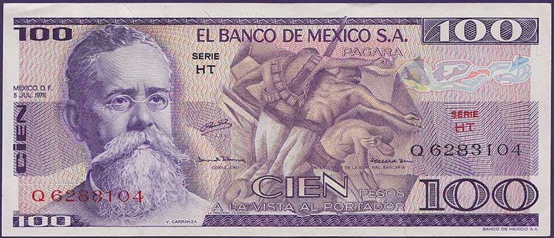 17.5.1979. Purple on multicolor underprint. V. Carranza at left, La Trinchera painting at center, bank title with S. A. Red series letters and a black serial number. 3 signatures. Back: Stone figure. Printer: BdM. Litho back. Series LS and later.