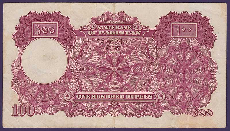 ND (1957). Green on violet and peach underprint. Portrait of Mohammed Ali Jinnah at center. Back: Badshahi Mosque in Lahore. Watermark: Portrait of Mohammed Ali Jinnah. Without overprint. 2 signature varieties.