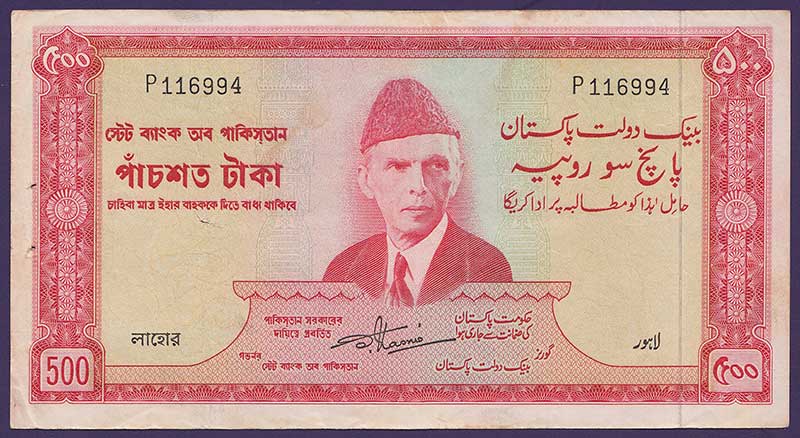 ND (1964). Blue-green on peach underprint. Portrait of Mohammed Ali Jinnah at center. Back: green. Sailing ships. Watermark: Mohammad Ali Jinnah. Latin signature. Two signature varieties.