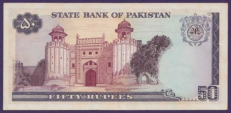 ND (1977-1984). Purple on multicolor underprint. Mohammed Ali Jinnah at right. Two signature varieties. Serial number varieties. Back: Main gate of Lahore fort. No Urdu text line beneath upper title. Watermark: Mohammed Ali Jinnah.