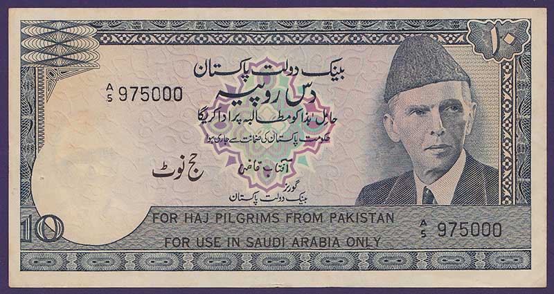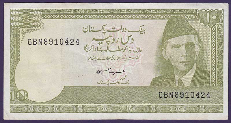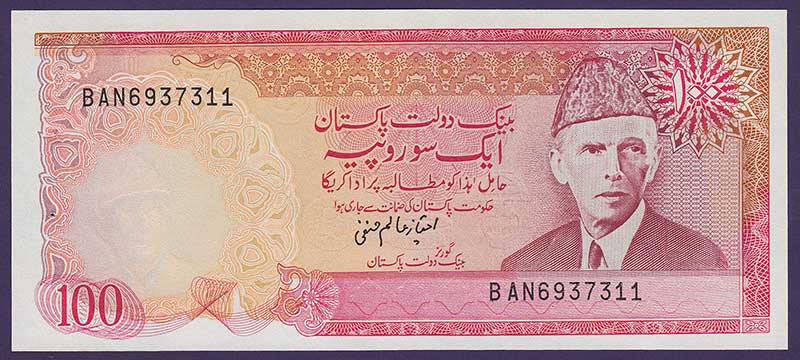 ND (1983-1984). Pale olive-green on multicolor underprint. Mohammed Ali Jinnah at right. Six signature varieties. Back: View of Moenjodaro. Urdu text line B beneath upper title. Watermark: Mohammed Ali Jinnah.