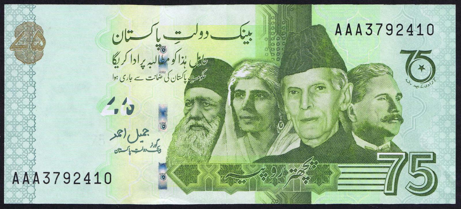 ND (2022). Green on green underprint. Portraits of Quaid-e-Azam Muhammad Ali Jinnah, Syed Ahmad Khan, Allama Muhammad Iqbal, and Mohtarma Fatima Jinnah at right. Commemorative "75" symbol at top right. The theme of the back of the banknote is climate change, and features a partial globe at left with text "SAVING CLIMATE AND SPECIES", a Markhor goat at center with landscape behind. "75 YEARS OF INDEPENDENCE" at bottom.