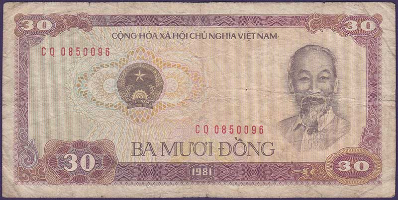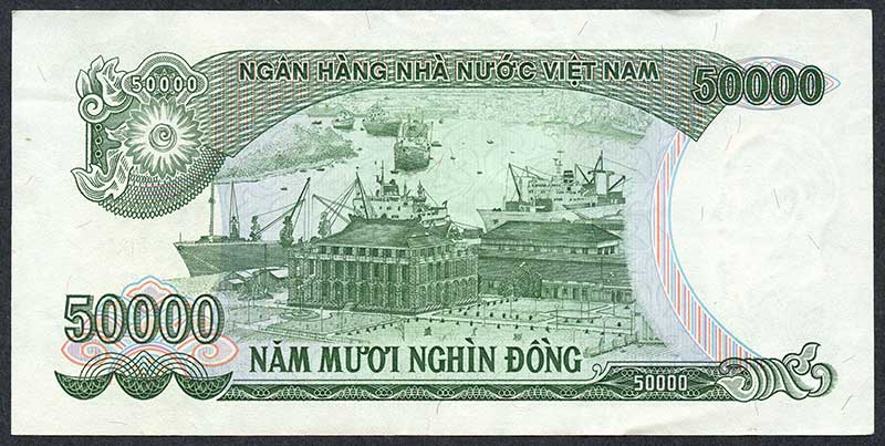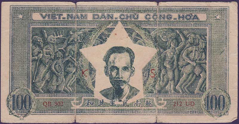 ND (1950). Blue and green. Agricultural scene at left, HCM at center, war scene at right. Back: Brown. Star, worker and soldier at center. (Nam-Bo).