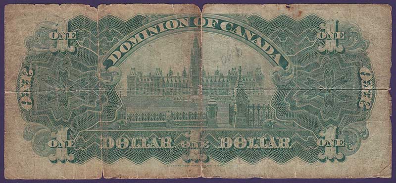 17.3.1917. Black on green underprint. Portrait Princess Patricia Ramsey (Princess of Connaught) at center without seal over right. ONE. Back: Green. Parliament building at center. Printer: ABNC-Ottawa. With ABNCo. imprint.