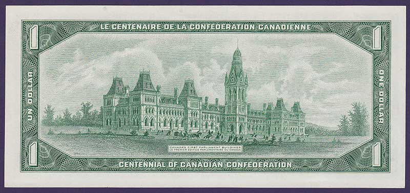 1967. Centennial of the Canadian Confederation. Black on green underprint. Queen Elizabeth II at right. back green; first Parliament Building. Regular serial number.