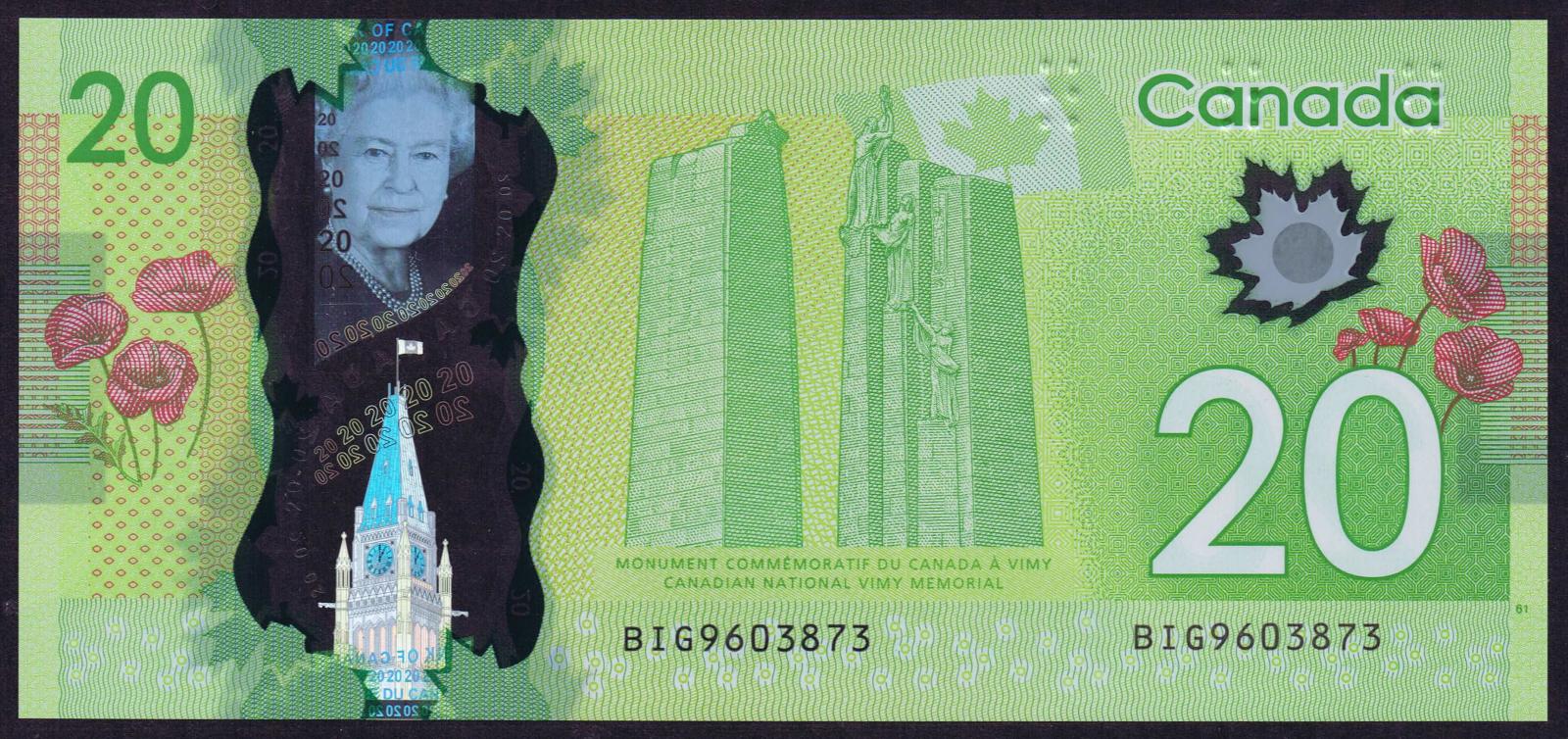 Green. Queen Elizabeth II. Large window with younger portrait of her majesty wearing a crown. Canadian maple leaf motifs. Back: Canadian National Vimy Memorial and poppies. Polymer banknote.