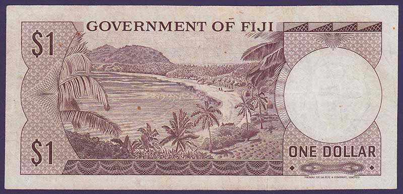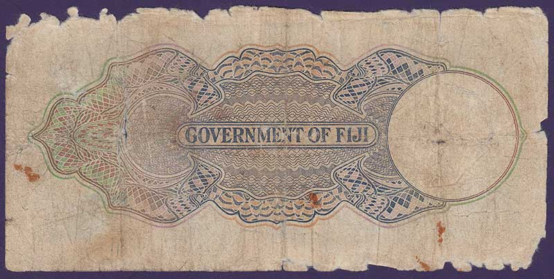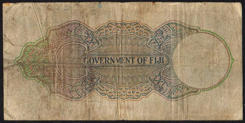 ND (1968). Brown on brown, green, and pink underprint. Queen Elizabeth II at right. Arms heading: GOVERNMENT OF FIJI at upper center. Yanuca beach scenes in Yasewas on back. Watermark: profile of Fijian. Printer: TDLR.