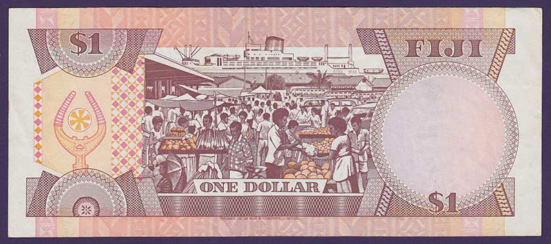 ND (1980). Brown on multicolored underprint. Queen Elizabeth II at right center, arms at center, artifact at right. Open air Suva markets at center on back. Denomination figures 8mm high. Watermark: profile Fijian head. Printer: TDLR.