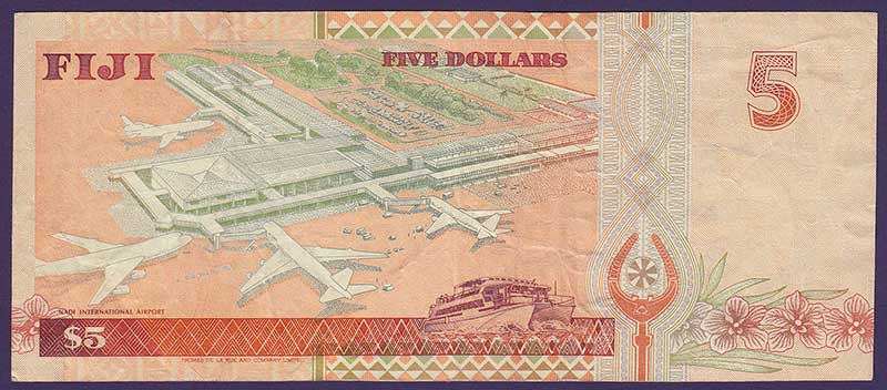 ND (1995). Brown-orange on violet and multicolored underprint. Mature bust of Queen Elizabeth II at right, arms at upper right. Bunedamu bird (White-throated pigeon) at lower left. Aerial view of Nadi International Airport at left center, ferry boat at lower center right on back. Segmented security thread. Watermark: profile of Fijian head. Printer: TDLR. Single letter prefix.