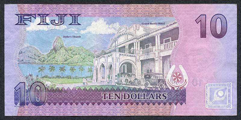 ND (2007). Purple on multicolored underprint. Mature bust of Queen Elizabeth II at right, arms at upper right. Novel numbering on both serial numbers. Baburau ni Bete (dish) at lower left. Foil security insert with motion. Back: Grand Pacific Hotel at right center. Joske's Thumb at left center. Signature title: Acting Governor.