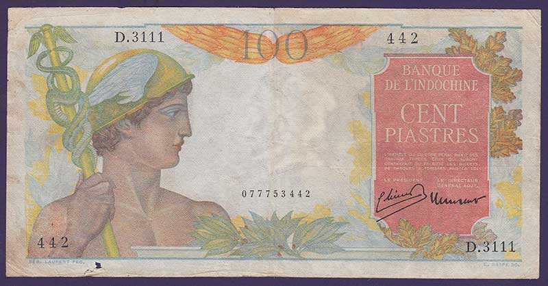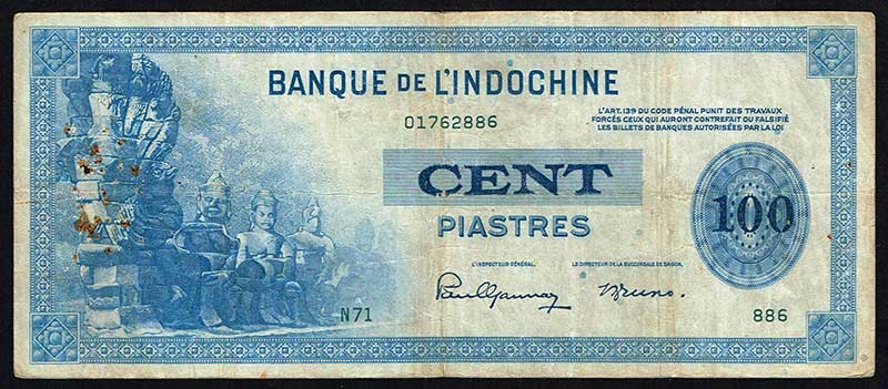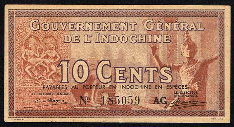 ND (1945). Green. Man with straw hat and baskets at right. Back: Frieze from Angkor Wat. Printer: ABNC (without imprint). Printed in the U.S. and England for issue in Indochina after WW II.