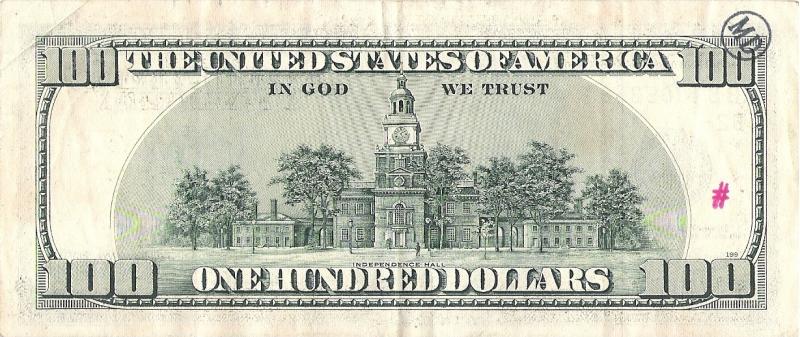 1996. (A1-L12). Benjamin Franklin at left center. Green value at lower right. Security thread at left. Back: Independence Hall. Watermark: Benjamin Franklin.