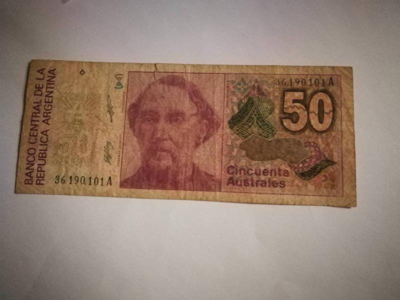 Brown on multicolored underprint. Plaza de Mayo in Buenos Aires at center on back. SERIE C-I. 5 Signature varieties. Watermark: arms. Without colored threads in paper.