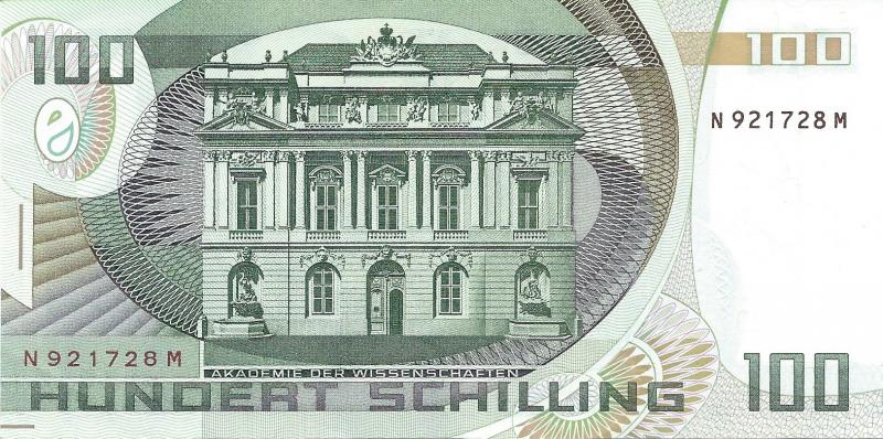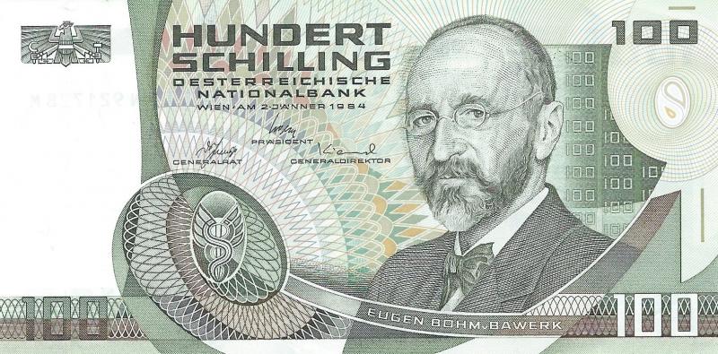 2.1.1984 (1985). Dark green, gray, and dark brown on multicolored underprint. Eugen Bohm von Bawerk at right. Wissenschaften Academy in Vienna at left center on back. 3 Serial number varieties.